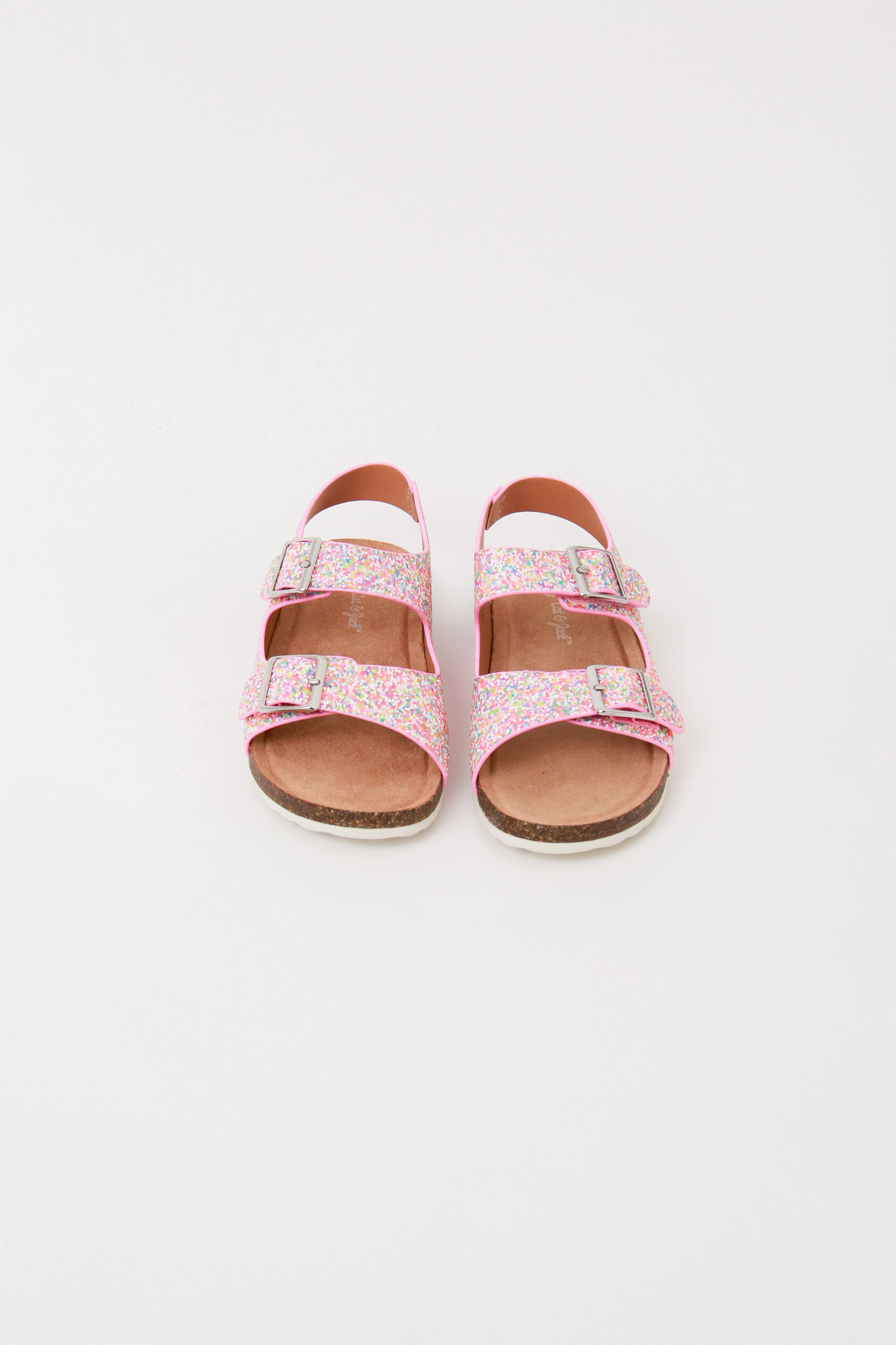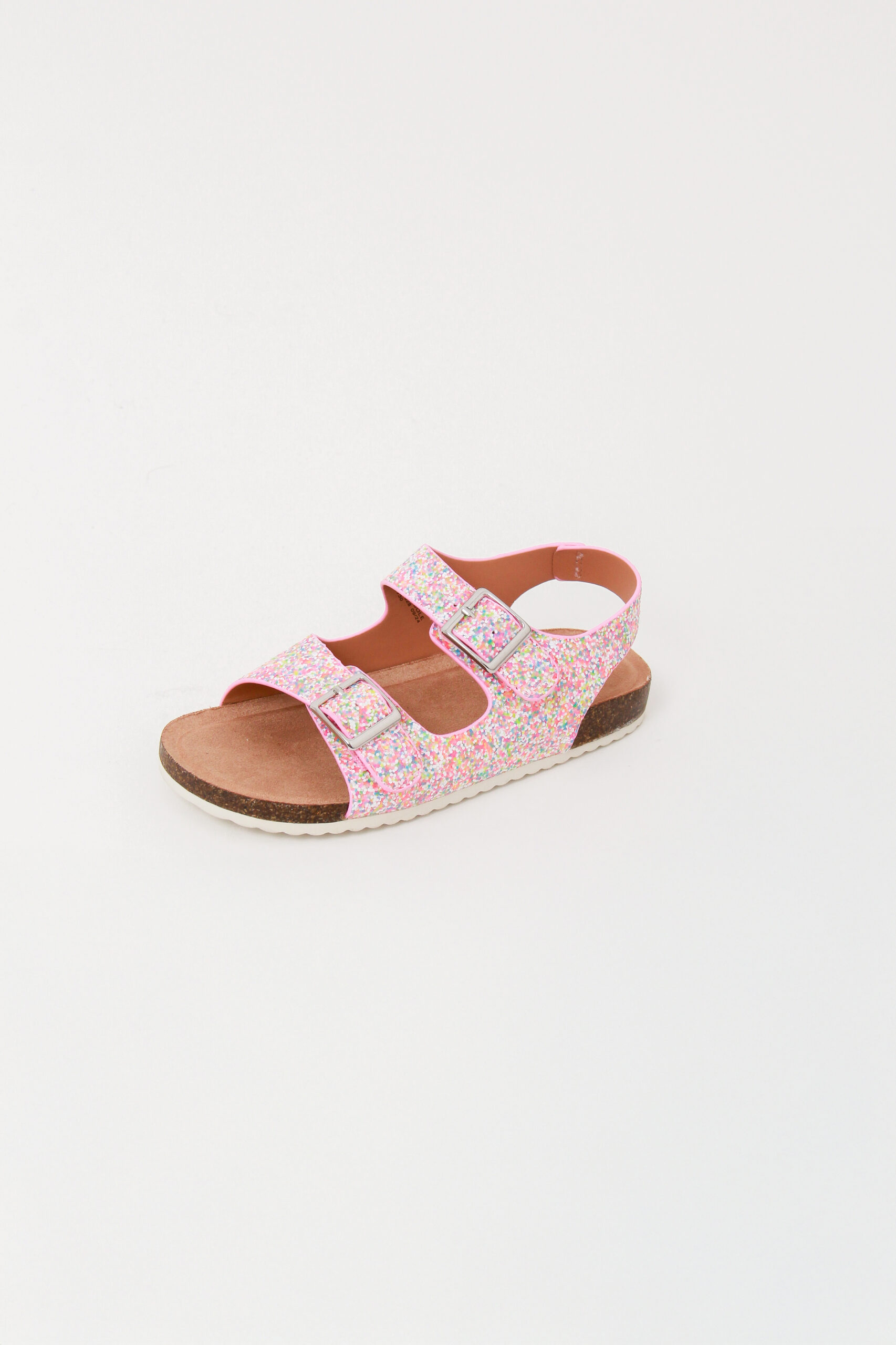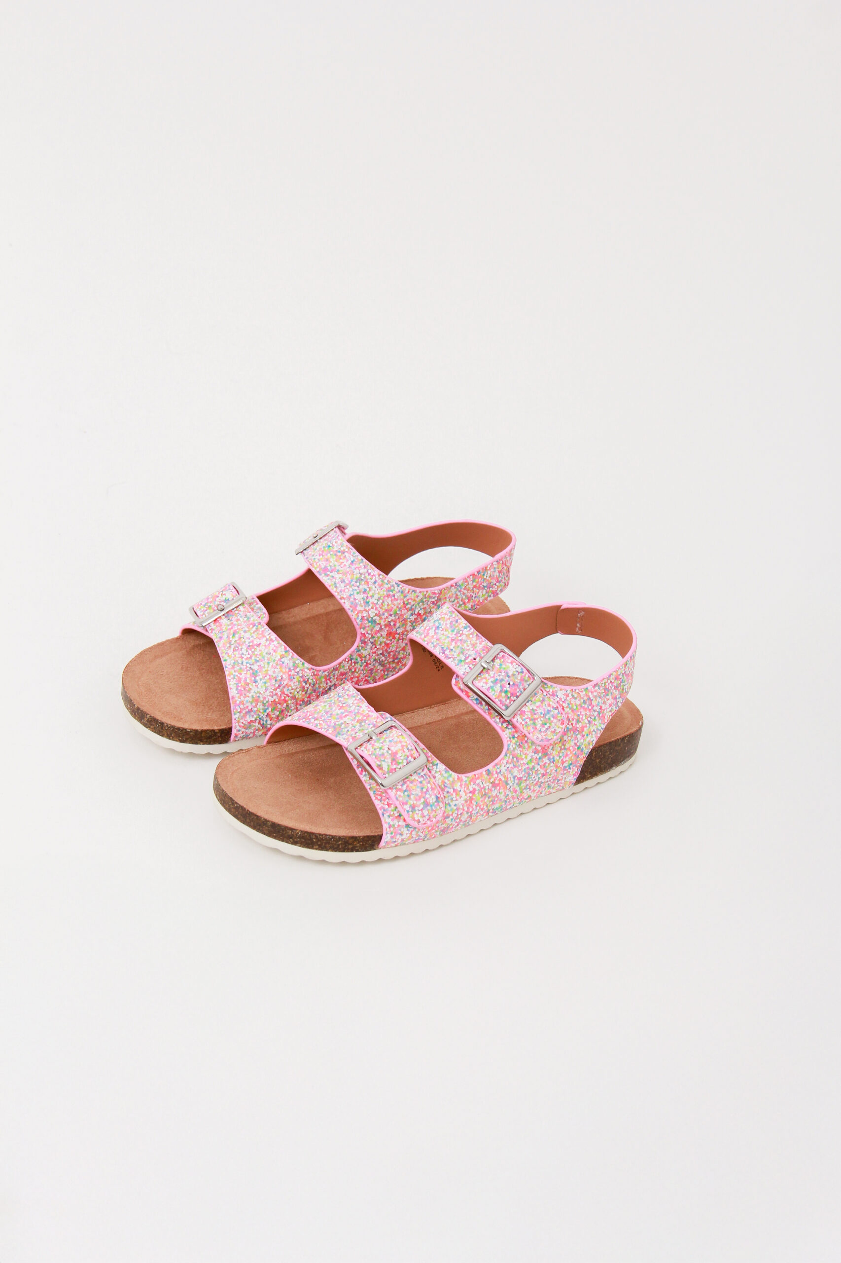 Sandalia para niña,  multicolor con brillos y rosa con broche de perlas